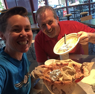 lunch: bowl with 1/2 brown, 1/2 white rice, chicken, mild salsa, sour cream, lettuce